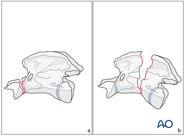 Fractures of C2 (Axis) can occur in the axial dens (a) or the axial body (b), with or without involvement of the spinal canal.
