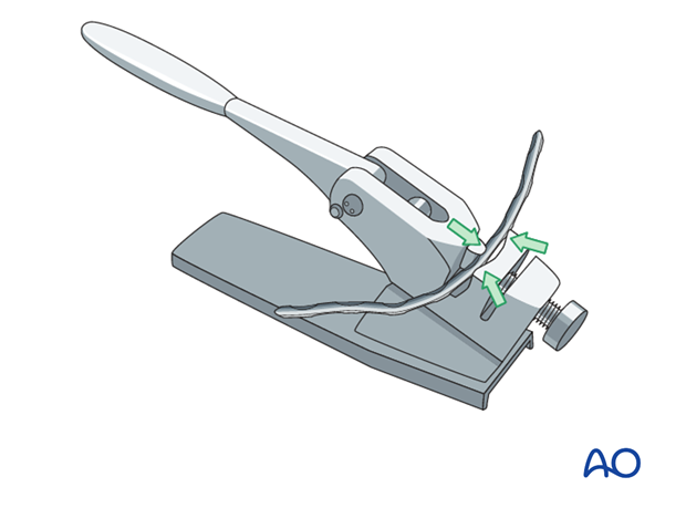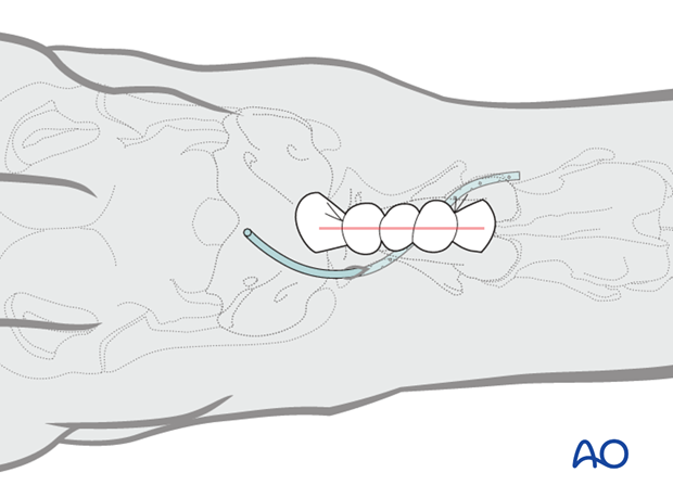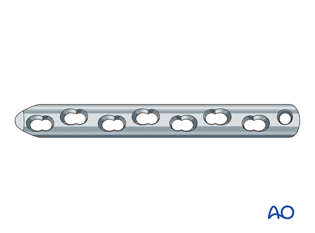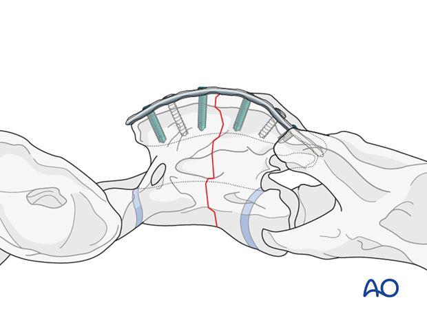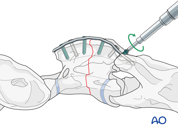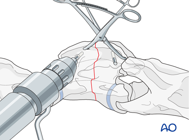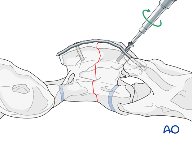 One cortex screw is inserted into each fragment in load fashion. The correct length of the screws is determined with the help of fluoroscopy.