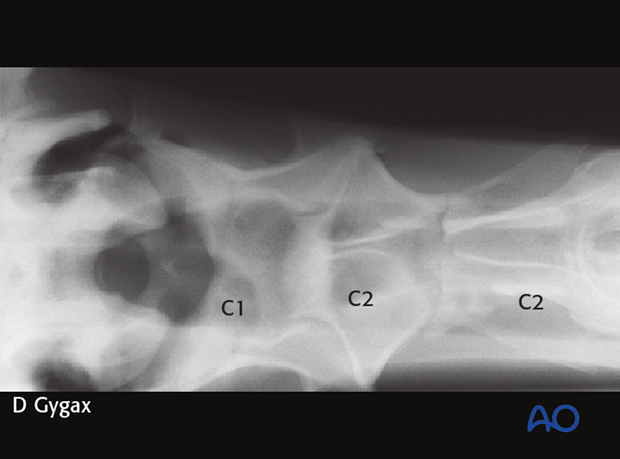 After exposing the dorsal surfaces of the atlas and axis, the alignment of the vertebrae is corrected and maintained with bone-holding forceps.